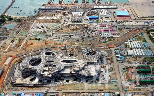 海口免稅商業中心頂部搭建穹形屋頂,這種屋頂中間隆起而四周下垂成拱形。屋頂采用圓球形的張力膜結構,采用索膜結構設計,膜面支撐在72根輻射狀的鋼索上。