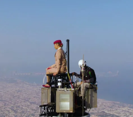 攝制組和這名女特技演員在峰頂上待了大約5個小時,她穿著阿聯酋航空公司的制服,佩戴防墜器,系在一個直接連接在峰頂上的特制平臺上。一架無人機被用來捕捉連續的鏡頭,拍攝完整的序列,可謂是驚為天人。