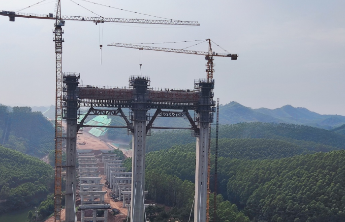 南橫高速是廣西高速路網“橫九線”的重要組成部分,也是廣西、廣東之間新省際通道的重要部分。近日南橫高速的重點項目沙坪河特大橋17號墩主塔順利完成封頂作業,這是繼16號墩主塔封頂后的又一突破性進展,標志著大橋將全面進入主梁牽索掛籃施工。