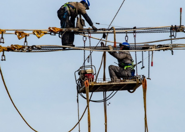 架設高壓線路屬于高空作業,不僅施工難度大,危險性也大。安徽亳州電網建設施工現場,電力工人在百米高空中進行高空架線。為了確保工人安全作業,電力工人統一佩戴防墜器、安全帶、安全繩、安全帽等個人保護裝置,做好各項安全防護措施。